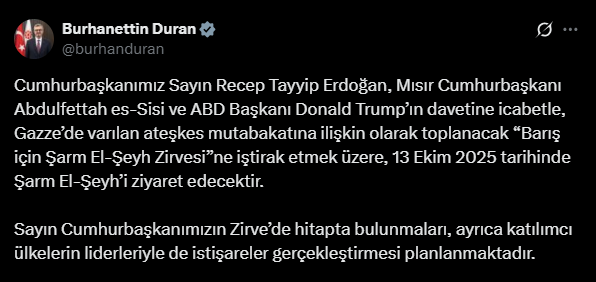"Cumhurbaşkanımız Sayın Recep Tayyip Erdoğan, Mısır Cumhurbaşkanı Abdulfettah es-Sisi ve ABD Başkanı Donald Trump’ın davetine icabetle, Gazze’de varılan ateşkes mutabakatına ilişkin olarak toplanacak “Barış için Şarm El-Şeyh Zirvesi”ne iştirak etmek üzere, 13 Ekim 2025 tarihinde Şarm El-Şeyh’i ziyaret edecektir.