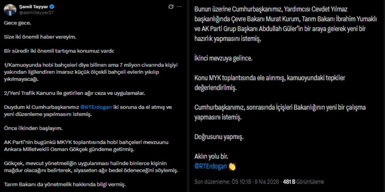 Tayyar'ın paylaştığı bilgilere göre, hobi bahçeleriyle ilgili yıkım kararları ve bu yöndeki kararlı tutum görüşüldüğü sırada Osman Gökçek araya girerek Cumhurbaşkanı Erdoğan’a uyarıda bulundu.
