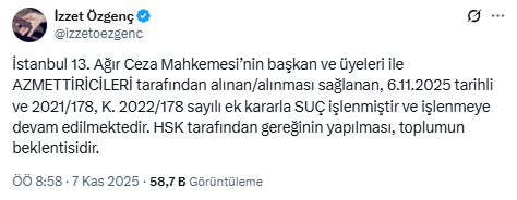 "MAHKEME BAŞKAN VE ÜYELERİ TARAFINAN SUÇ İŞLENMİŞTİR"Sosyal medya hesabından farklı saatlerde paylaşım yapan Özgenç, ilk paylaşımında, "İstanbul 13. Ağır Ceza Mahkemesi’nin başkan ve üyeleri ile AZMETTİRİCİLERİ tarafından alınan/alınması sağlanan, 6.11.2025 tarihli ve 2021/178, K. 2022/178 sayılı ek kararla SUÇ işlenmiştir ve işlenmeye devam edilmektedir. HSK tarafından gereğinin yapılması, toplumun beklentisidir" ifadelerini kullandı.