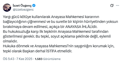 "YARGI GÜCÜ KÖTÜYE KULLANILIYOR"Özgenç, bir sonraki paylaşımında, yargı gücünün kötüye kullanıldığını belirterek, bu suretle kişinin hürriyetinden yoksun bırakılmaya devam edilmesinin de Anayasa ihlali olduğunu kaydetti.