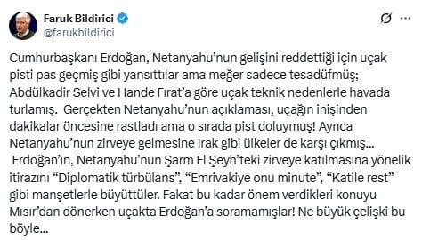 Bildirici, Hürriyet yazarları Abdulkadir Selvi ve Hande Fırat’ın açıklamalarını hatırlatarak, olayın iddia edildiği gibi siyasi değil, teknik bir sebepten kaynaklandığını belirtti. Selvi ve Fırat’a göre, Erdoğan’ın uçağı Şarm El Şeyh Havalimanı’na iniş hazırlığı yaptığı sırada pist doluydu ve bu nedenle uçak bir süre Kızıldeniz üzerinde tur atmak zorunda kaldı.