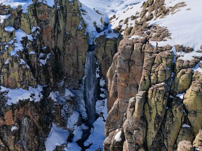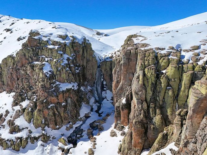 Eriyen kar sayesinde yeniden canlanan Çır Şelalesi görüntülendi