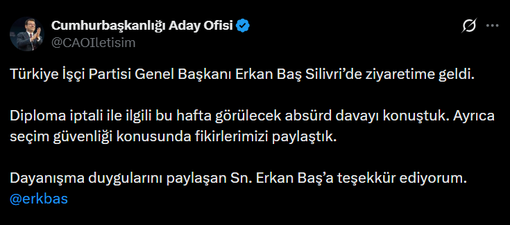 "Türkiye İşçi Partisi Genel Başkanı Erkan Baş Silivri’de ziyaretime geldi. Diploma iptali ile ilgili bu hafta görülecek absürd davayı konuştuk. Ayrıca seçim güvenliği konusunda fikirlerimizi paylaştık. Dayanışma duygularını paylaşan Sn. Erkan Baş’a teşekkür ediyorum."