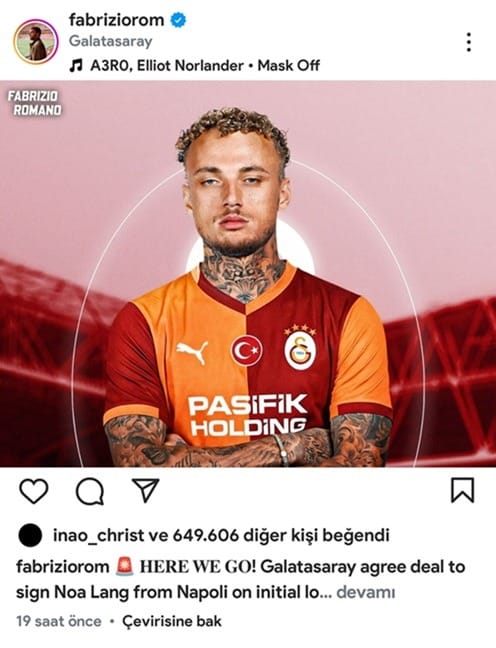 19 yaşındaki oyuncu, Fabrizio Romano'nun Galatasaray'ın Noa Lang transferini duyurduğu paylaşımı beğendi.