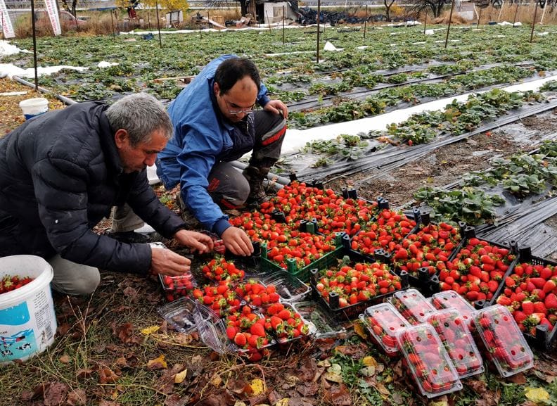 Çevresindeki dağların karla kaplı bulunduğu ilçede soğuk havaya "ısı tülü" ile önlem alıp üretimlerini sürdüren çiftçiler, aralık ayına kadar hasadın devam edeceğini öngörüyor.