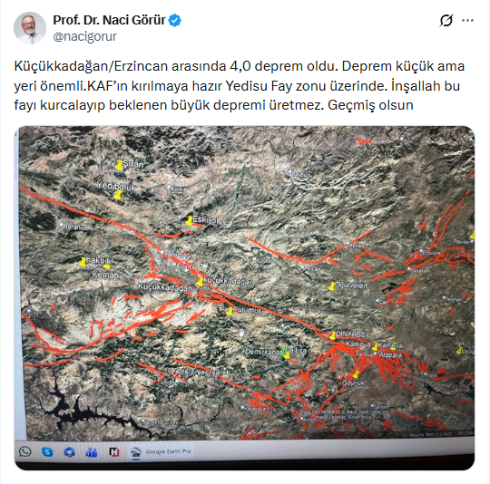 Görür, sosyal medya platformu X hesabından yaptığı paylaşımda depremin Küçükkadağan ile Erzincan arasında gerçekleştiğini ifade ederek, konumun önemine vurgu yaptı.
