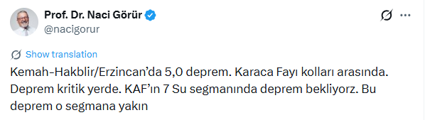 NACİ GÖRÜR KORKUTAN BİR AÇIKLAMA YAPTI!Deprem bilimci Prof. Dr. Naci Görür, Erzincan’da yaşanan depremin ardından yürekleri ağza getiren bir açıklamada bulundu. Görür, sosyal medya hesabından yaptığı açıklamada depremin kritik bir noktada meydana geldiğini belirterek “Kemah-Hakbilir. Erzincan’da 5,0 deprem. Karaca Fayı kolları arasında. Deprem kritik yerde.” ifadelerini kullandı.