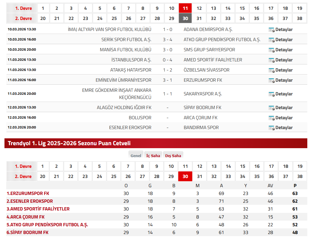 AMEDSPOR FARKI 2'YE İNDİRDİBuna ek olarak Erzurumspor ile 3. sıradaki Amedspor arasındaki puan farkı da iyice azaldı. Diyarbakır ekibinin, İstanbulspor'u 4-0 mağlup etmesiyle taraflar arasındaki puan farkı 2'ye indi.