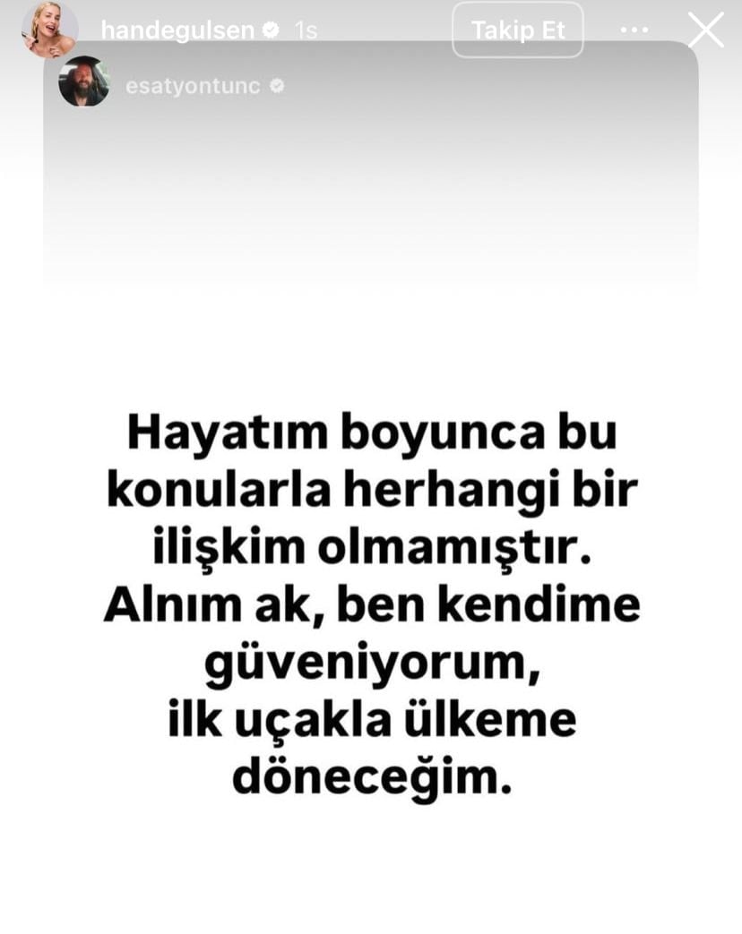 Bu arada Hande Yontunç Dominik'te olan eşiyle dün akşam telefonda canlı görüşme yaptığı anlardan bir kareyi "Geri sayım başladı" diye paylaşmıştı. Yakalama kararı sonrası Hande Yontunç bu paylaşımını sildi.