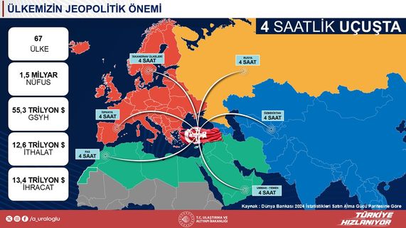 Bakan Uraloğlu, “4 saatlik uçuşla 67 ülkeye gidilebilen bir merkezdeyiz. 55 trilyon dolarlık bir gayrisafi milli hasıla ve yaklaşık 25 trilyon dolarlık ticaret hacmine sahip bir bölgede bulunuyoruz. Önemli dünya lojistik merkezlerinden bir tanesiyiz. Özellikle Doğu-Batı aksında, son zamanlarda gelişen Doğu-Batı'yı destekleyen Kuzey-Güney ya da diyagonal hatlar anlamında ülkemiz gerçekten kıymetli bir noktada.” açıklamasında bulundu.