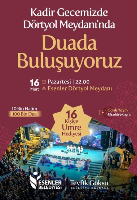 Esenler Belediyesi tarafından geleneksel olarak Dörtyol Meydanı’nda gerçekleşen Kadir Gecesi,’ne özel “10 Bin Hatim 100 Bin Dua” programı, bu yıl yine on binlerce Esenlerliyi bir araya getirecek.