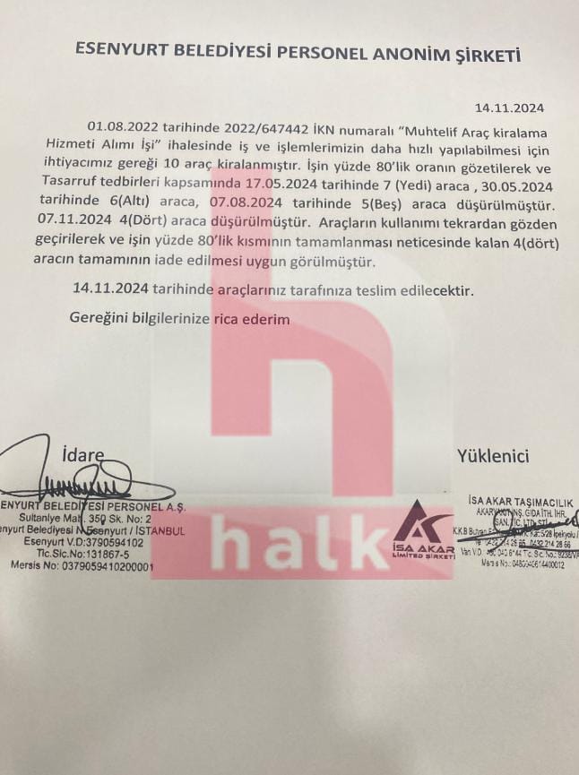 Söz konusu belgede şu ifadelere yer verildi: "01.08.2022 tarihinde 2022/647442 IKN numaralı "Muhtelif Araç kiralama Hizmeti Alımı İşi" ihalesinde iş ve işlemlerimizin daha hızlı yapılabilmesi için ihtiyacımız gereği 10 araç kiralanmıştır. İşin yüzde 80'lik oranın gözetilerek ve Tasarruf tedbirleri kapsamında 17.05.2024 tarihinde 7 (Yedi) araca, 30.05.2024 tarihinde 6(Altı) araca, 07.08.2024 tarihinde 5 (Beş) araca düşürülmüştür. 07.11.2024 4 (Dört) araca düşürülmüştür. Araçların kullanımı tekrardan gözden geçirilerek ve işin yüzde 80'lik kısmının tamamlanması neticesinde kalan 4 (dört) aracın tamamının iade edilmesi uygun görülmüştür."