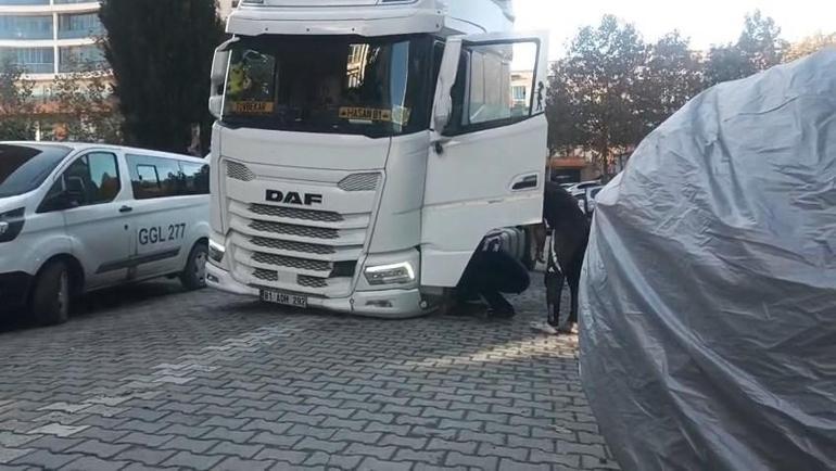 Mehter Çeşme Mahallesi 2007 Sokak'ta seyir halinde ilerleyen dorsesiz TIR çekicisinin ön lastiği kilit taşlı yola saplandı. Şoför ve çevredekiler aracın lastiğini bulunduğu yerden çıkarmaya çalıştı.