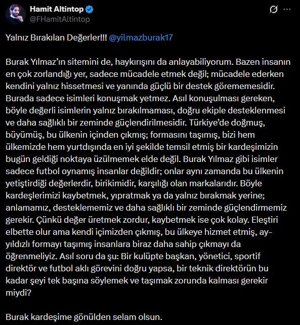 A Milli Takım'ın eski yıldızı Hamit Altıntop, Gaziantep FK'den istifa eden ve TFF'ye yönelik açıklamaları ile sosyal medyayı sallayan Burak Yılmaz'a destek verdi.