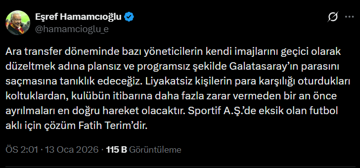"Ara transfer döneminde bazı yöneticilerin kendi imajlarını geçici olarak düzeltmek adına plansız ve programsız şekilde Galatasaray’ın parasını saçmasına tanıklık edeceğiz. Liyakatsiz kişilerin para karşılığı oturdukları koltuklardan, kulübün itibarına daha fazla zarar vermeden bir an önce ayrılmaları en doğru hareket olacaktır. Sportif A.Ş.’de eksik olan futbol aklı için çözüm Fatih Terim’dir."