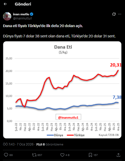 Ekonomist İnan Mutlu’nun sosyal medya platformu X’te paylaştığı karşılaştırma, Türkiye’de derinleşen geçim krizini bir kez daha gözler önüne serdi. Mutlu’nun paylaşımına göre dünya fiyatı kilogram başına 7 dolar 38 sent olan dana eti, Türkiye’de 20 dolar 31 sente kadar yükseldi. Güncel kurla (43,05 TL) hesaplandığında dana etinin kilosu yaklaşık 874 liraya denk geliyor.