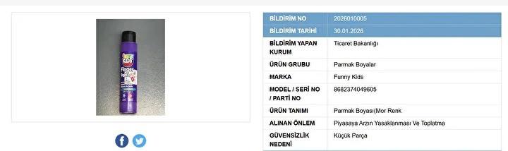 Kocaeli’nin Darıca ilçesinde üretilen Funny Kids markasına ait mor renk parmak boyası, yapılan laboratuvar testlerinden geçemedi. Üründe yer alan küçük parçaların çocuklar için boğulma riski oluşturduğu belirlendi.