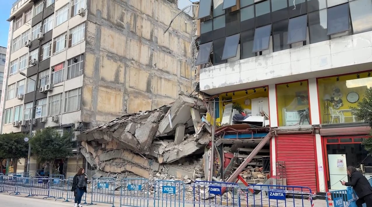 Hatay'ın İskenderun ilçesinde, ağır hasarlı bir binanın yıkımı sırasında meydana gelen çökme anında, kaldırımda yürüyen bir anne ve kızının beton parçalarından son anda kurtulduğu görüntüler dehşete düşürdü.