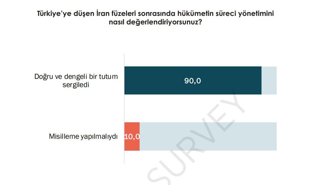 Buna ek olarak, katılımcıların ezici bir çoğunluğu İran'dan ateşlenip Türkiye topraklarına yönelen balistik füze vakalarında hükümetin izlemiş olduğu politikayı, "doğru ve dengeli" bulundu.