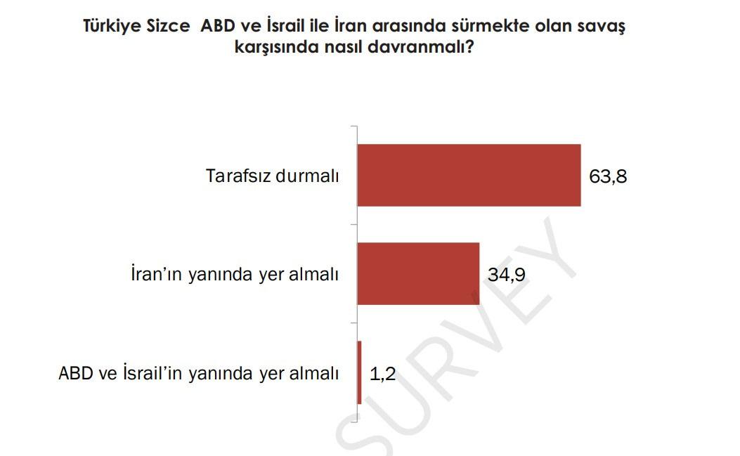 Vatandaşın yüzde 63,8'i Türkiye'nin "tarafsız kalmasını" belirtirken, yüzde 34,9'u "Ankara, Tahran'ın yanında yer almalı" dedi.