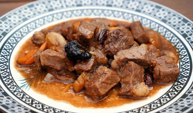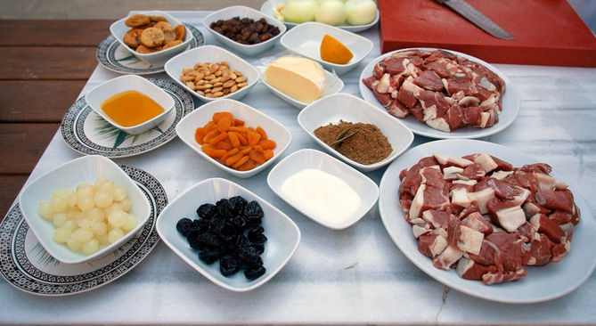 Tatlı, mayhoş ve tuzlu tatların dengeli birleşimiyle beğeni toplayan bu yemek, kuzu eti, kuru meyveler, bal, tarçın, sarımsak ve arpacık soğanıyla hazırlanıyor.
