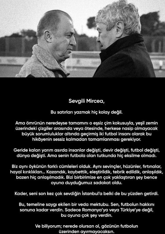 Terim, sosyal medya hesabından yaptığı paylaşımda Mircea Lucescu için "Kader, seni son kez çok sevdiğin İstanbul'a belki de bu yüzden getirdi." dedi.