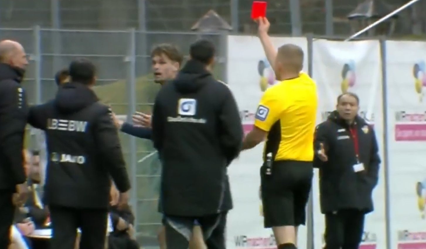 KIRMIZI KART GÖRDÜTSG Hoffenheim II'nin 21 yaşındaki sol beki Yannis Hör, bir taç atışı kullanmadan önce sahaya giren bir topu uzaklaştırmak istedi. Fazla olan topu, hafif bir şekilde oyun alanı dışına yollayan 21 yaşındaki oyuncunun vuruşunda top, rakip yedek kulübesine yöneldi. Hor yanlışlıkla VfB Stuttgart II'nin teknik ekibinden bir ismi isabet aldı.