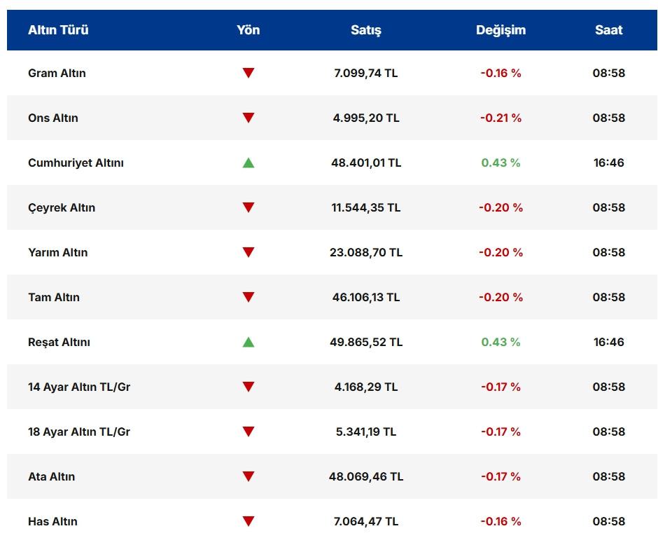 GRAM ALTINGram altın güne 7 bin 111 liradan başladı. Gün içinde en düşük 7 bin 87 lira, en yüksek de 7 bin 130 lira seviyesi görüldü. Şu sıralar 7 bin 93 liradan alıcı buluyor.