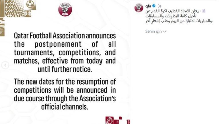 "Katar Futbol Federasyonu, bugünden itibaren ve bir sonraki duyuruya kadar tüm turnuvaların, müsabakaların ve maçların ertelendiğini duyurdu. Müsabakaların yeniden başlaması için belirlenen yeni tarihler, Federasyonun resmi kanalları aracılığıyla zamanı geldiğinde duyurulacaktır. "