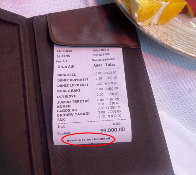 FİŞİN ALTINDAKİ DETAY DİKKAT ÇEKTİFişin alt kısmında yer alan "Service is not included" (servis ücreti dahil değildir) ibaresi ise dikkat çekti. Olayın ardından restoran yetkilileri iddialara itiraz ederken, turistlerin paylaştığı fotoğraflar ve restoran tarafından düzenlenen fiş büyük bir tartışmanın fitilini ateşledi.