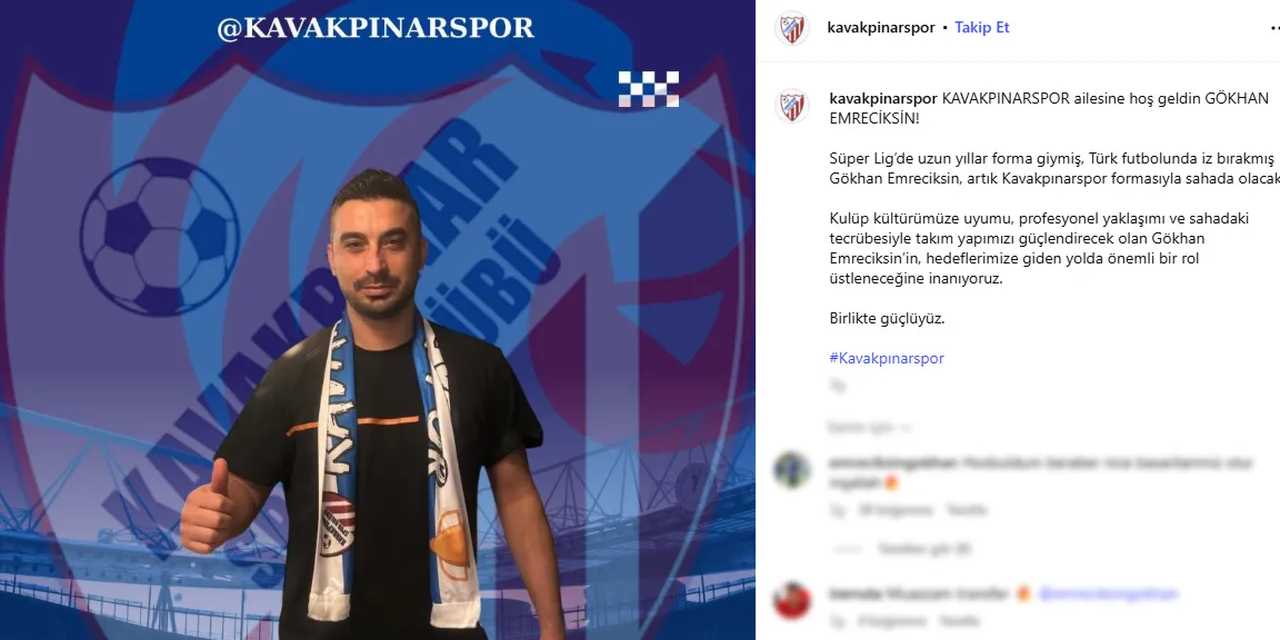 EMRECİKSİN'DEN İLK AÇIKLAMA GELDİGökhan Emreciksin, Kavakpınarspor'un transfer paylaşımına sessiz kalmadı ve Instagram hesabından "Hoş buldum. Beraber nice başarılarımız olur inşallah" yorumunu yazdı.