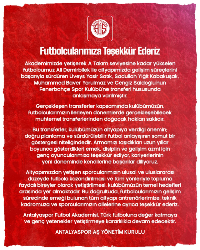 ANTALYASPOR'DAN RESMİ AÇIKLAMAAntalyaspor Kulübü, transferlere ilişkin yaptığı açıklamada, futbolcuların gelişim süreçlerine vurgu yaptı. Açıklamada, Ali Demirbilek'in akademiden A Takım seviyesine kadar yükseldiği, diğer dört oyuncunun ise altyapıda gelişimlerini sürdürdüğü belirtilirken, transferler konusunda Fenerbahçe ile anlaşmaya varıldığı ifade edildi.