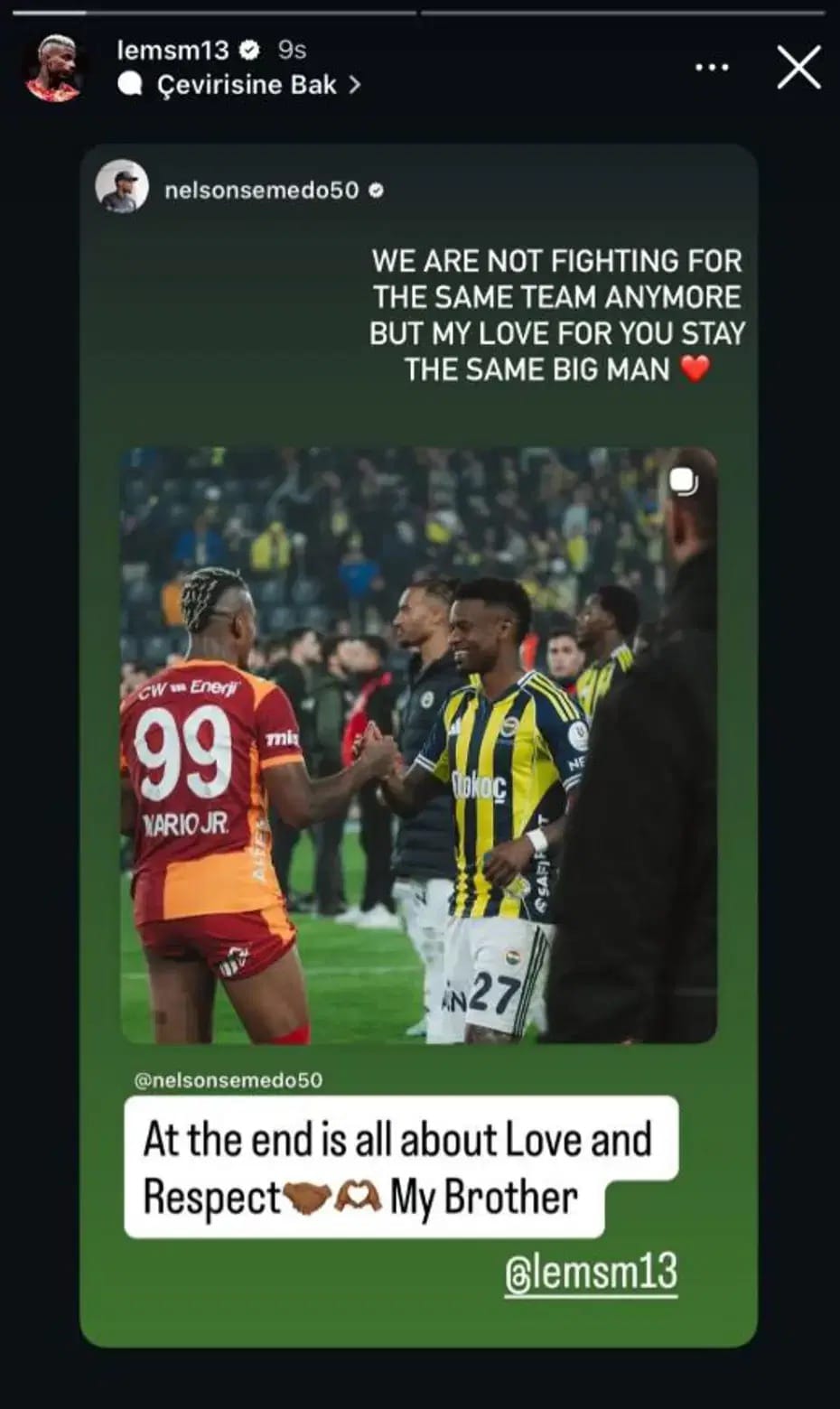 SEMEDO PAYLAŞTI, LEMINA KARŞILIK VERDİAncak Fenerbahçeli Nelson Semedo ile Galatasaraylı Mario Lemina'nın maçtan sonraki paylaşımları "Sahada olan sahada kalır" sözüne en güzel örneği oluşturdu.