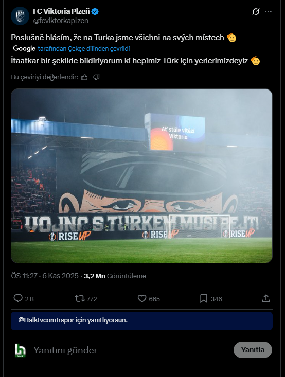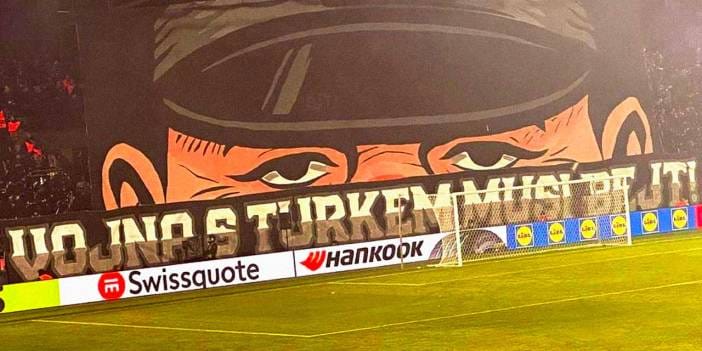 Plzen taraftarları, asker görseli bulunan ve üzerinde “Vojna s Turkem musi bejt” (Türklerle savaş olmalı) yazılı pankart açtı.