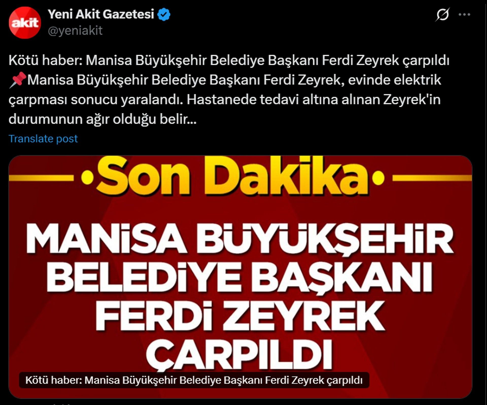 "ÇARPILDI" BAŞLIĞI VE HAKARETLERZekeriya Say'ın ismi, 11 Haziran 2025 tarihinde, evinde elektrik akımına kapılarak ağır yaralanan ve sonrasında hayatını kaybeden Manisa Büyükşehir Belediye Başkanı Ferdi Zeyrek hakkındaki paylaşımlarıyla gündeme gelmişti. Yeni Akit, Zeyrek'in yaralandığı haberi, kamuoyunda "alaycı" olarak yorumlanan "Manisa Büyükşehir Belediye Başkanı Ferdi Zeyrek çarpıldı" başlığıyla duyurmuştu.