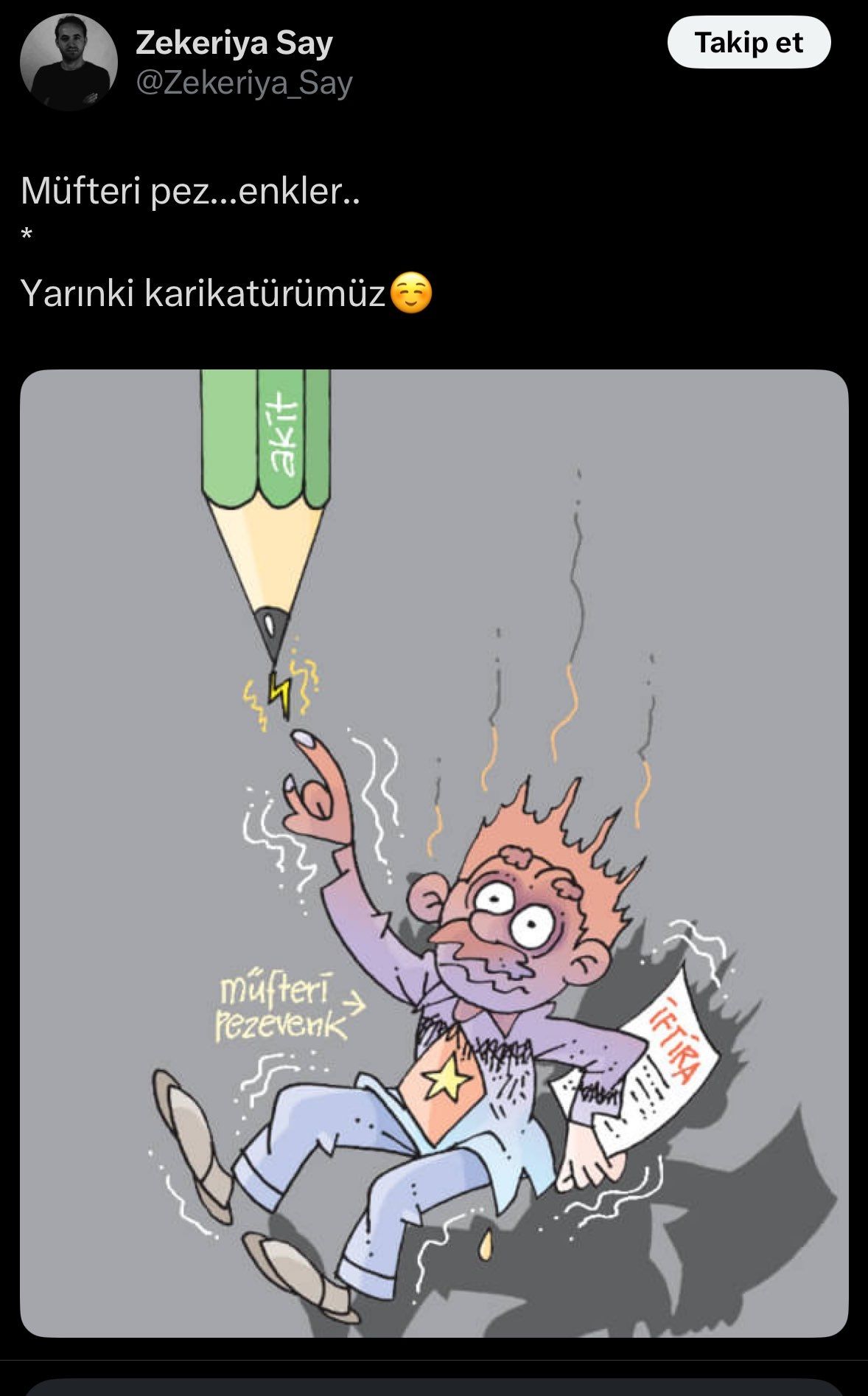 KARİKATÜR, ALEVİLERİ HEDEF ALMA VE PROTESTOCULARLA ALAY ETMEAncak Say'ın tartışma yaratan paylaşımları bununla sınırlı kalmadı. "Yarınki karikatürümüz" notuyla paylaştığı bir başka görsel de halkın tepkisini çekti.