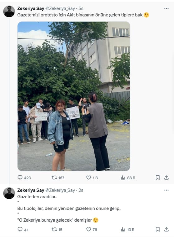 Yeni Akit'in "çarpıldı" başlığına tepki gösteren bir grup genç, gazete binası önünde protesto düzenledi. Protestoda, “Bu bir gazete değildir, bu bir televizyon kanalı değildir; bu bir paçavradır. Gazetecilikle hiçbir ilgisi kalmamış, halkı bilgilendirmek yerine zehirleyen bir propaganda aracıdır” denildi. Zekeriya Say, bu protestoya katılan gençleri de hedef alarak onlarla alay eden paylaşımlarda bulundu.