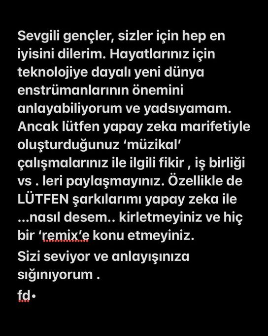Şarkıcı paylaşımında şu ifadeleri kullandı; "Sevgili gençler, sizler için her zaman en iyisini diliyorum. Hayatlarınızda teknolojinin ve yeni dünyanın getirdiği enstrümanların önemini anlıyor ve yadsımıyorum. Ancak lütfen yapay zekâ aracılığıyla oluşturduğunuz 'müzikal' çalışmalarla ilgili fikir, iş birliği ya da benzeri talepleri benimle paylaşmayınız. Özellikle de lütfen şarkılarımı yapay zekâ ile… nasıl desem… ‘kirletmeyiniz’ ve herhangi bir remix’e konu etmeyiniz. Sizi seviyor, anlayışınıza sığınıyorum."