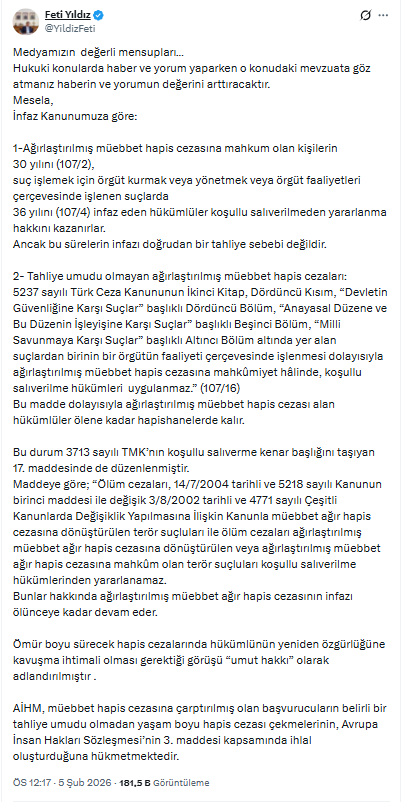 İNFAZ KANUNU'NDAKİ SÜRELER VE KOŞULLARYıldız, 5275 sayılı İnfaz Kanunu'ndaki düzenlemelere dikkati çekerek şu bilgileri paylaştı: "Ağırlaştırılmış müebbet hapis cezasına mahkûm olanlar, cezalarının 30 yılını infaz ettiklerinde, suç işlemek amacıyla örgüt kurmak, yönetmek veya örgüt faaliyeti kapsamında işlenen suçlar nedeniyle ağırlaştırılmış müebbet alanlar ise 36 yılını tamamladıklarında, koşullu salıverilmeden yararlanma hakkı kazanabiliyor". Yıldız, sürelerin dolmasının doğrudan bir tahliye anlamına gelmediğinin özellikle altını çizdi.
