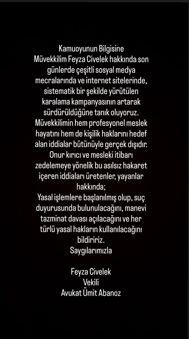 Avukatı Ümit Abanoz aracılığıyla açıklamada bulunan Feyza Civelek, sosyal medya hesabından bulunduğu paylaşımında; "Kamuoyunun bilgisine; Müvekkilim Feyza Civelek hakkında son günlerde çeşitli sosyal medya mecralarında ve internet sitelerinde, sistematik bir şekilde yürütülen karalama kampanyasının artarak sürdürüldüğüne tanık oluyoruz. Müvekkilimin hem profesyonel meslek hayatını hem de kişilik haklarını hedef alan iddialar bütünüyle gerçek dışıdır. Onur kırıcı ve mesleki itibarı zedelemeye yönelik bu asılsız hakaret içeren iddiaları üretenler, yayanlar hakkında; yasal işlemlere başlanılmış olup, suç duyurusunda bulunulacağını, manevi tazminat davası açılacağını ve her türlü yasal hakların kullanılacağını bildiririz. Saygılarımızla..." ifadelerine yer verdi.