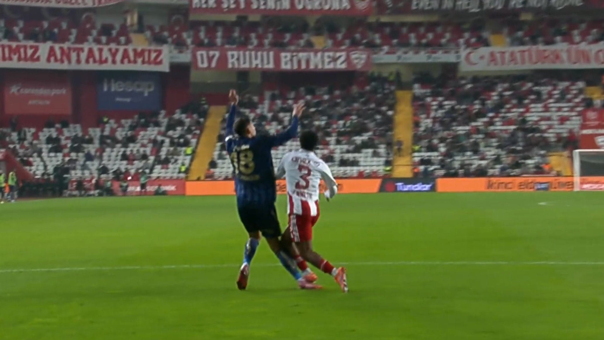 MERT MÜLDÜR’ÜN POZİSYONUAntalyaspor ceza sahasında yaşanan hava topu mücadelesinde Mert Müldür, rakibi Paal’ın müdahalesiyle yerde kaldı. Fenerbahçe cephesi penaltı itirazında bulundu fakat hakem oyunu sürdürdü. Bu sırada VAR sistemi de devreye girmedi.