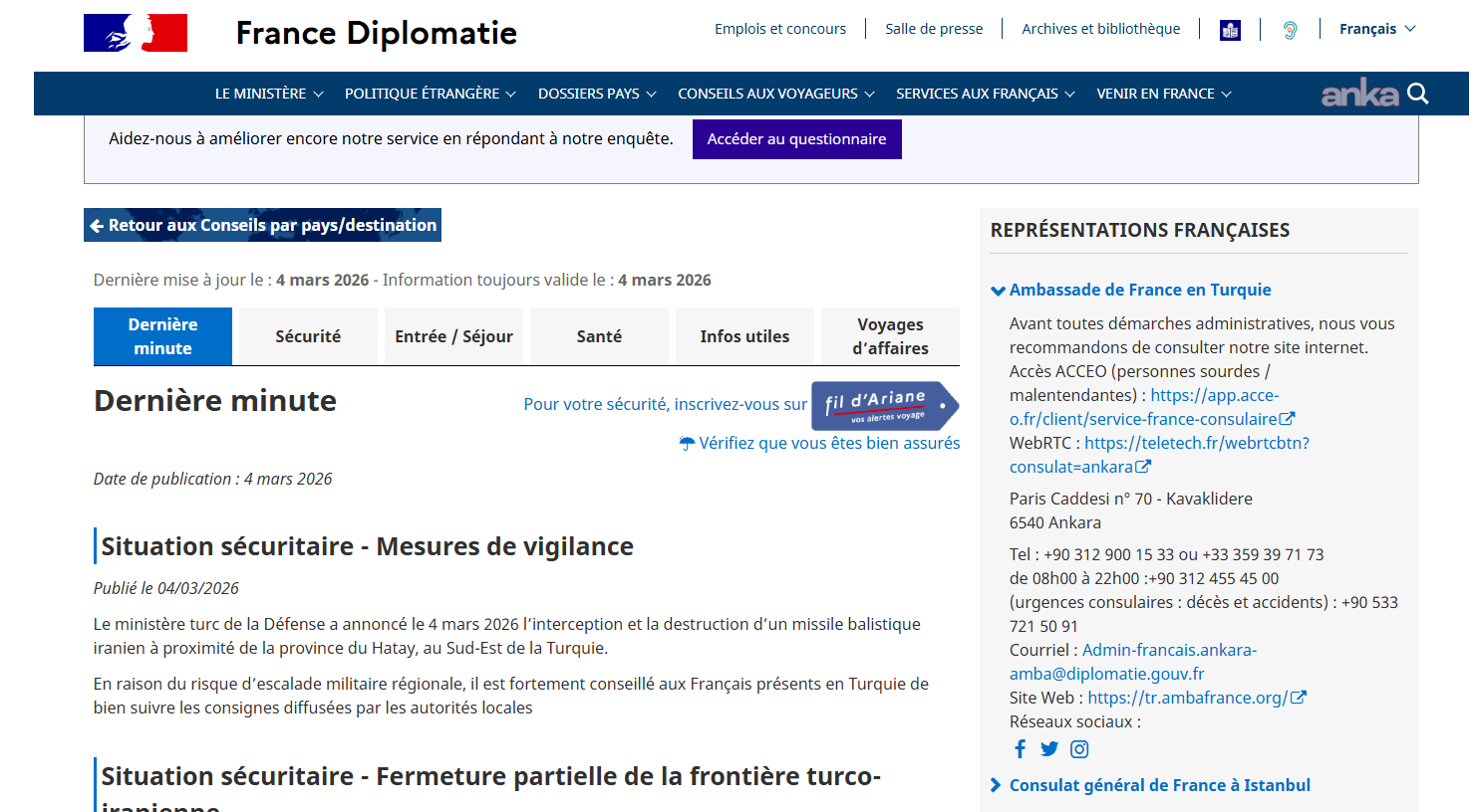 Fransa Dışişleri, vatandaşlarını özellikle Hatay ve çevresinde dikkatli olmaları konusunda uyararak, resmi talimat ve yönlendirmeleri takip etmelerini önerdi.