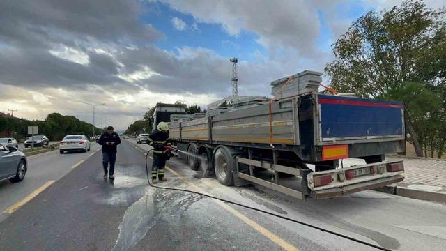 Muğla’nın Menteşe ilçesi Atatürk Bulvarında seyir halindeyken fren tutmayan 48 DM 368 plakalı mermer yüklü TIR’ın balatalarında yangın çıktı. İtfaiye ekipleri yangını kısa sürede söndürdü.