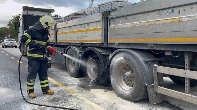 Atatürk Bulvarı’nda seyir halindeki mermer yüklü 48 DM 368 plakalı TIR’ın arka lastiklerinden duman çıkmaya başlayınca durum 112 Acil Çağrı Merkezine bilgi verildi. TIR’ın freni tutmaması nedeniyle freni zorlayan sürücü balataların yanmasına neden oldu. Olay yerine gelen Muğla Büyükşehir Belediyesi itfaiye ekipleri dumanları köpük sıkarak söndürdü.