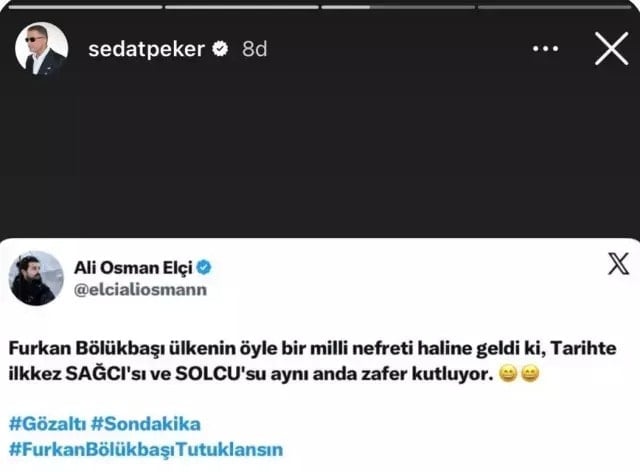 Furkan Bölükbaşı için "Öyle bir milli nefreti haline geldi ki, tarihte ilk kez sağcısı ve solcusu aynı anda zafer kutluyor" ifadelerini kullanan sosyal medya kullanıcısı Sedat Peker'in dikkatini çekti. Peker kullanıcının yorumunu alarak kendi sayfasında paylaştı. Bu paylaşım üzerinde 'Sedat Peker'in de tavrı belli oldu' değerlendirmesi yapıldı.