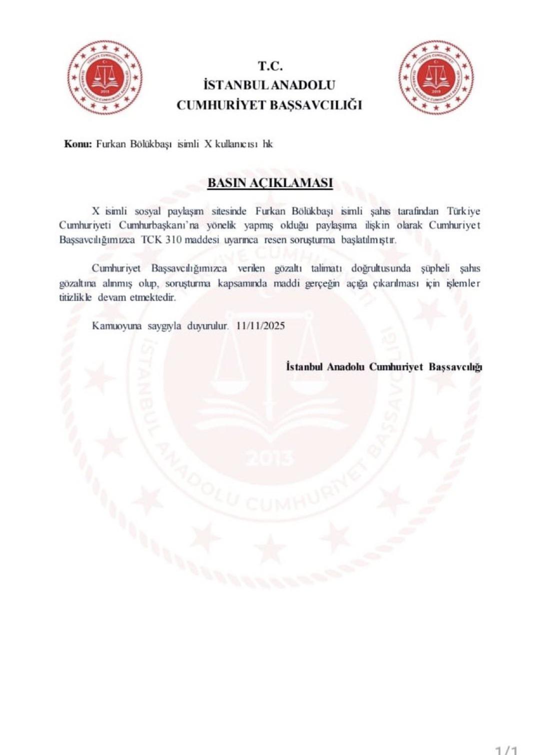 "X isimli sosyal paylaşım sitesinde Furkan Bölükbaşı isimli şahıs tarafından Türkiye Cumhuriyeti Cumhurbaşkanı'na yönelik yapmış olduğu paylaşıma ilişkin olarak Cumhuriyet Başsavcılığımızca TCK 310 maddesi uyarınca resen soruşturma başlatılmıştır.