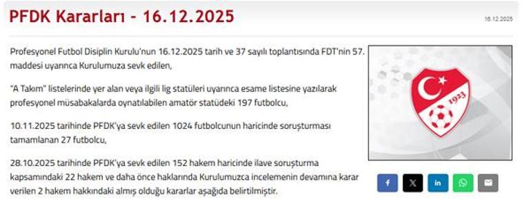 “A Takım” listelerinde yer alan veya ilgili lig statüleri uyarınca esame listesine yazılarak profesyonel müsabakalarda oynatılabilen amatör statüdeki 197 futbolcu, 10.11.2025 tarihinde PFDK’ya sevk edilen 1024 futbolcunun haricinde soruşturması tamamlanan 27 futbolcu, 28.10.2025 tarihinde PFDK’ya sevk edilen 152 hakem haricinde ilave soruşturma kapsamındaki 22 hakem ve daha önce haklarında Kurulumuzca incelemenin devamına karar verilen 2 hakem hakkındaki almış olduğu kararlar aşağıda belirtilmiştir.