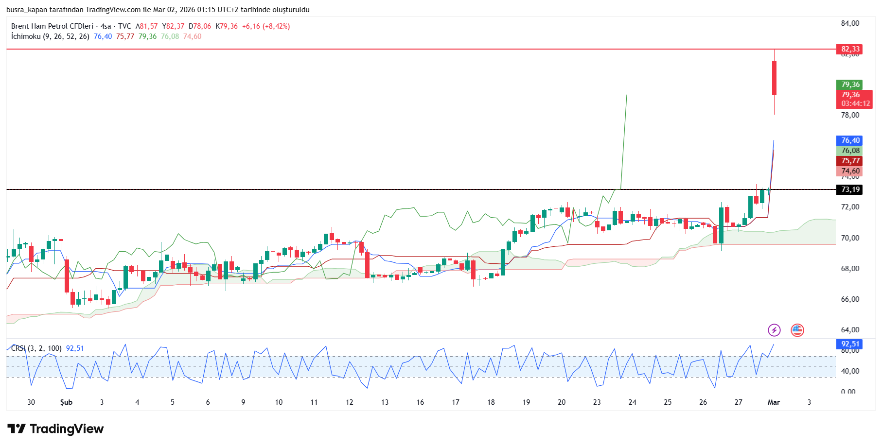 Ham petrol (usoil) geçtiğimiz haftayı 67.28 dolardan tamamlamıştı. Ham petrol yani usoil yüzde 12 'den fazla değerlenerek yeni haftaya 75.36 dolardan başladı.
