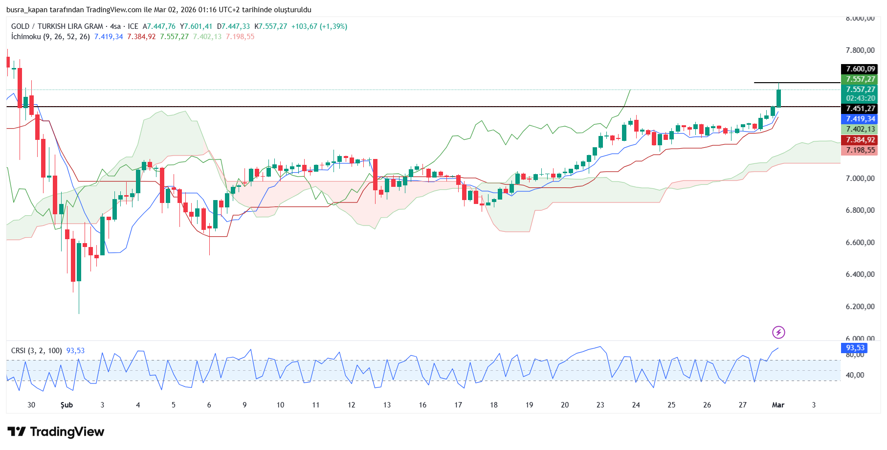 Gram altında da yukarı yönlü hareketlenmelerin olduğu görülüyor. Gram altın geçtiğimiz haftanın son işlem gününü 7 bin 453 liradan kapamıştı. Yeni haftanın ilk işlem gününde resmi rakamlarda 7 bin 600 lirada bulunuyor. Hafta sonu kuyumcular ve mobil bankacılık işlemlerinde gram altın Pazar günü piyasaların kapalı oldu günde 8 bin 500 liraya kadar ulaşmıştı.