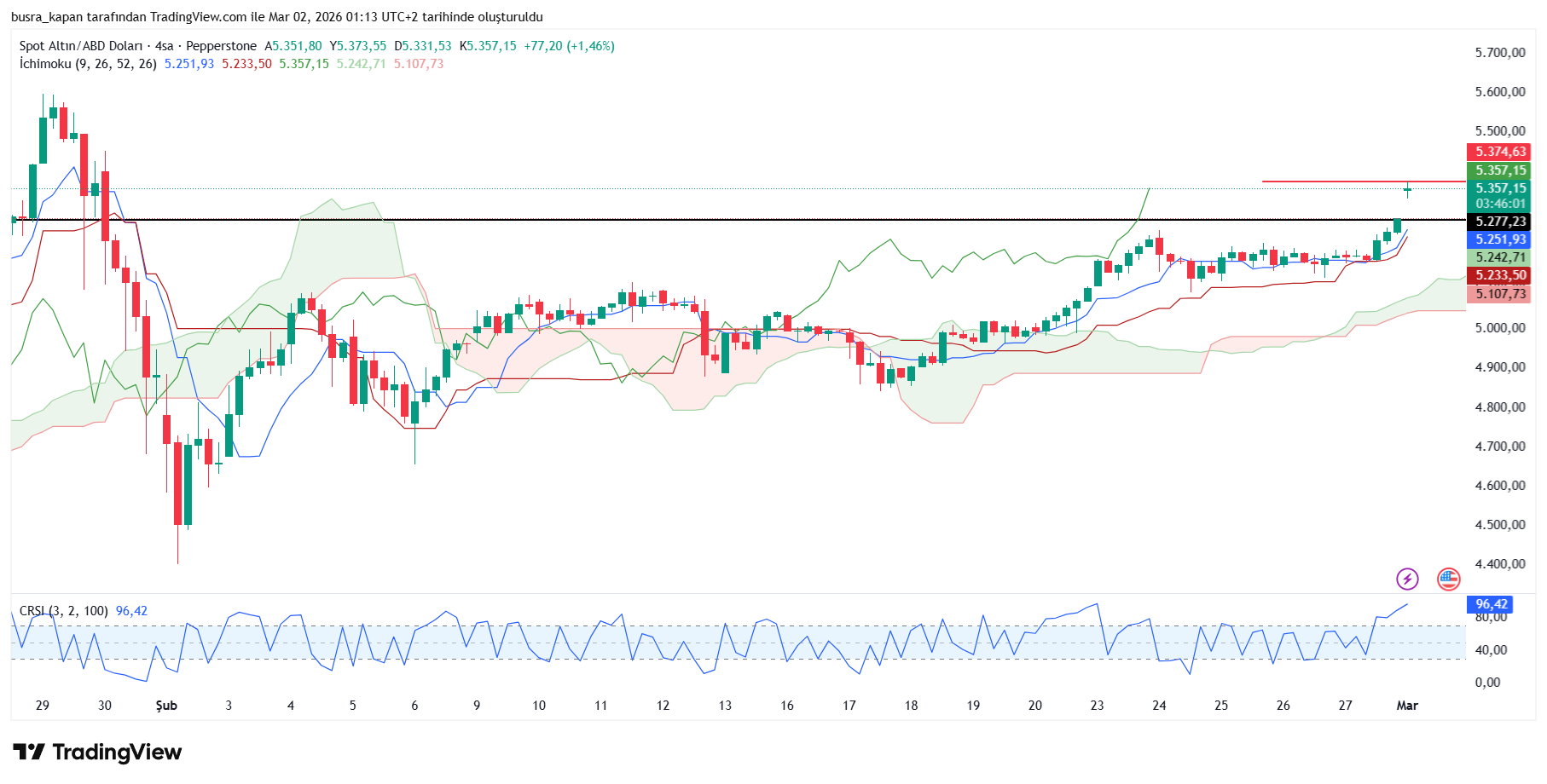 Ons altın geçtiğimiz haftanın son işlem gününü 5 bin 279 dolardan tamamlamıştı. Yeni haftanın ilk işlem gününde ons altın 5 bin 374 dolara yükselerek yüzde 2'ye yakın değerlendi.